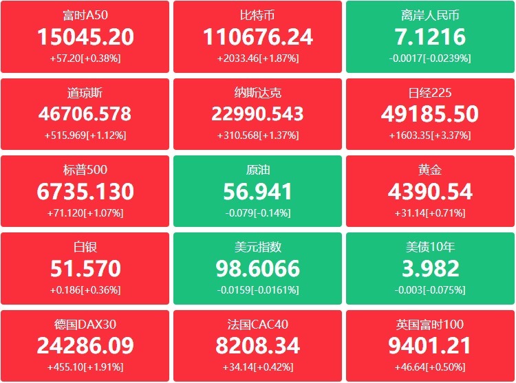 外汇:美元指数涨0.16%报98.592点,美元兑日元涨0.09%报150.74日元;欧元兑日元涨0.01%,英镑兑日元跌0.03%,欧元兑美元跌0.11%,英镑兑美元跌0.16%,美元兑瑞郎跌0.12%,澳元兑美元涨0.23%,纽元兑美元涨0.33%,美元兑加元涨0.13%;离岸人民币兑美元报7.1241元,较上周五涨8点;比特币涨4.36%至11.10万美元上方,以太币涨4.38%报4005美元。